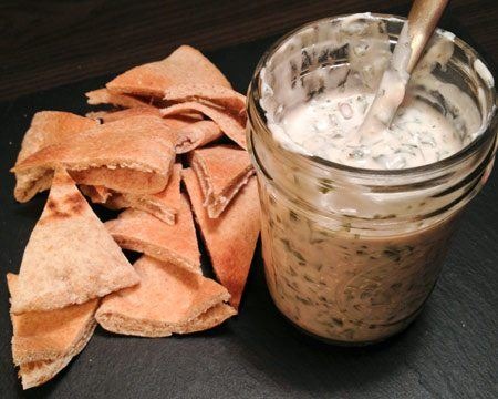 - In a bowl, muddle the first 6 ingredients together into a paste. Stir in the Greek yogurt and salt, and season with pepper, to taste. Serve with warm pita rounds or crackers.