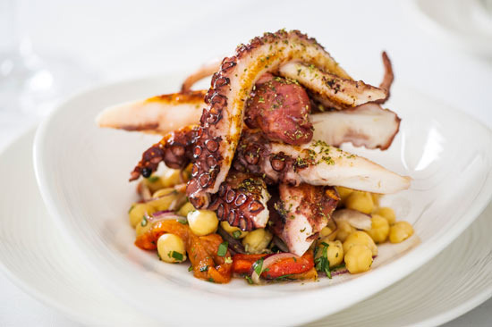 Char-grilled Spanish octopus, served on chickpea salad with capers, red pepper, and onion.