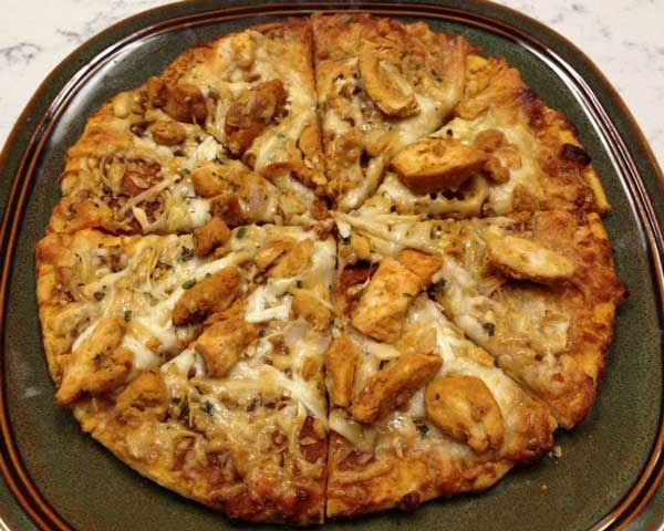 About 15 minutes in a 400-degree oven yields a pizza that doesn't sag at all and mercifully doesn't drip anything onto the oven floor below. After letting it rest for a couple minutes, a sharp knife was needed to cut through the crispy, not-too-crunchy crust. There was enough chicken on the pizza to make sure that some got into every bite, but the sauce was very sweet and overpowered just about everything else on the pizza. We didn't taste much in the way of smokiness from the Gouda, and there were only a few discernible flecks of onion. That said, the chicken was easily identifiable as sliced boneless breast meat, the crust-to-cheese ratio was spot on (even though the crust itself was a little bland), and the pizza was very flavorful and not easy to walk away from unfinished.