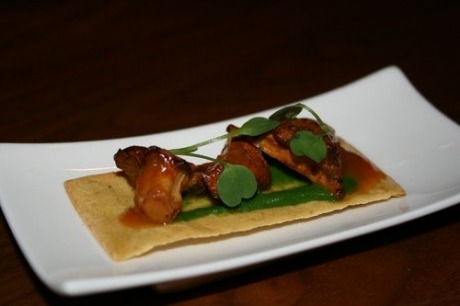 Chanterelle Fava, made with chanterelle mushrooms, fava bean puree, housemade lentil cracker, and tangerine gastrique, as inspired by Edward Hopper's Kelly Jenness House.