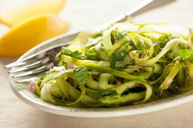 While delicious cooked, raw asparagus feels extra fresh in this tart salad. The asparagus is shaved into thin ribbons. Serve immediately or let the salad marinate several hours to blend flavors.