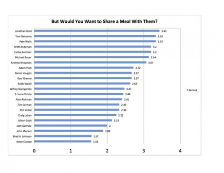 When it came to breaking bread or sharing a brew with critics, our panelists were kinder in 2013 than in 2012. They gave almost a full star more to this year's most likeable critic, Jonathan Gold, who reprised the role ("That would be so fun!" said one chef). They even demonstrated more willingness to invite their least favorite writers to the table — Brad Johnson (1.57 stars, "I invited Brad to share a cup of coffee with me, but he declined") and Steve Cuozzo (1.56) were virtually tied. Not far behind were TIME's Josh Ozersky (2 stars, who one chef said he'd never eat with because "I'd like to keep my food down") and John Mariani (who with 1.89 stars fell dramatically from second place). For the record, one chef came to Mariani's defense noting, "Just had a meal with John and would do it again." The least-likeable writer from 2012, Tim Carman, climbed five spots, a virtual invitation to the chef's table. Click for Full-Screen Likeablity Graphic