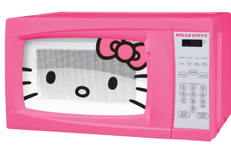 Sanrio has released a line of Hello Kitty-themed kitchen appliances, including a mini-fridge and ice cream maker. This hot pink microwave oven comes decorated with the face and signature red bow of everyone's favorite Japanese cat.