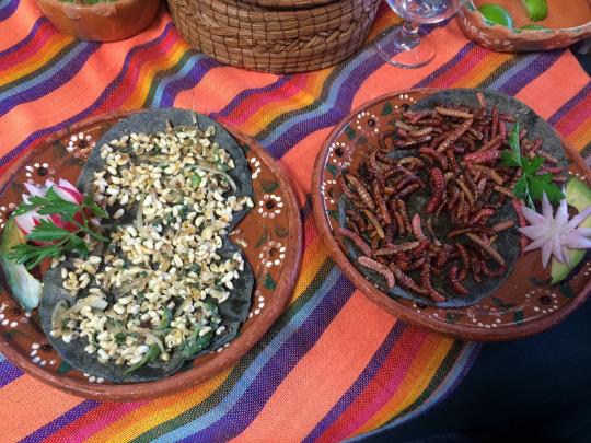 Chapulines (fried and seasoned grasshoppers) are to Mexicans what popcorn is to Americans: a favorite salty snack with an addictive crunch. In the historic district of Mexico City, fried whole grasshoppers, crickets, and even stinkbugs are sold in heaping piles — wings and all — at Mercado San Juan de Pugibet. We recommend the garlic-chili seasoned ones. Once you get over the initial horror of munching on insects, they're pretty tasty and protein packed. Don't miss the chicatana salsa (made from Oaxacan flying ants). Or just tuck into some ant larva or agave worm tacos at El Hildaguense.