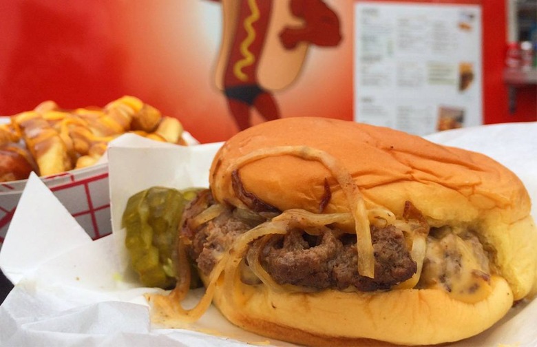 Past customers of Baby's Badass Burgers have noted that something about the presentation can be a bit much. More specifically, that means tiny booty shorts, tight tank tops, and high heels worn by the "burger babes," who you can view here. The truck, the creation of ex-New York restaurateur Erica Cohen and event planner Lori Barbera, also has a logo that features a scantily clad girl holding up two burgers. All of this, of course, makes it wildly popular on LA's streets and also on TV — the truck has had cameos on both Entourage and CBS' The Defenders.