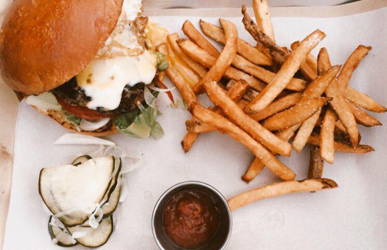 For the record, Fukuburger gets its name from co-founder Colin Fukunaga's last name, not an expletive. He and Robert "Mags" Magsalin serve "All-American" burgers (and a panko-encrusted chicken katsu sandwich) with a Japanese twist, featuring toppings like wasabi mayo, pickled red ginger, avocado cream, Japanese barbecue sauce, and furikake (dried and ground fish, sesame seeds, chopped seaweed, sugar, and salt). Looking for a unique side dish? Try the togarashi garlic fries with banana ketchup.