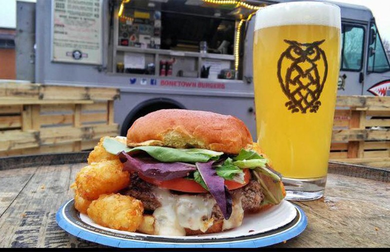 Bernie's Burger Bus is in an old-school short bus that takes the school shtick all the way, from labeling press reviews as "report cards" and truck swag as "school supplies" on its website, right down to the name of the burgers. There's The Principal (classic burger), The Substitute (blue cheese, bacon, and caramelized onions), the seasonal Study Hall (Cheddar, barbecue sauce, and pork belly) and the Fire Drill (roasted tomatoes, pepper jack, chipotle aïoli, spicy guac, and crispy tortilla strips). But let's face it, if you're going back to school, you're going to either want to take down The Bully (two patties, Cheddar, fixings, and roasted tomatoes) or go to Detention (two applewood-smoked bacon grilled cheese sandwiches used as the bun, two patties, Cheddar, "tipsy onions," and fixings). If you can actually stomach the whole Detention, you get on the Bernie's wall of fame. But perhaps you want to save room for the fries, which we included in this year's list (at No. 38) of America's 50 best French fries.