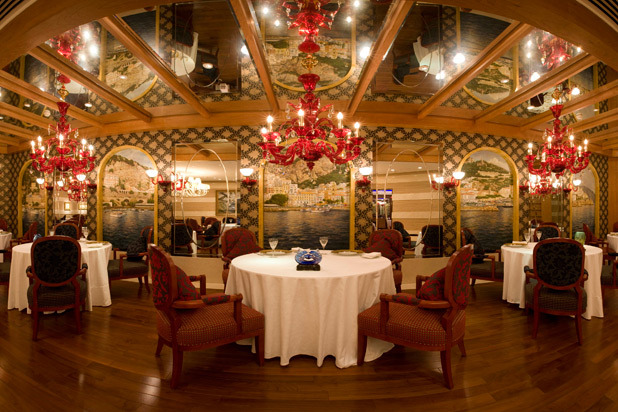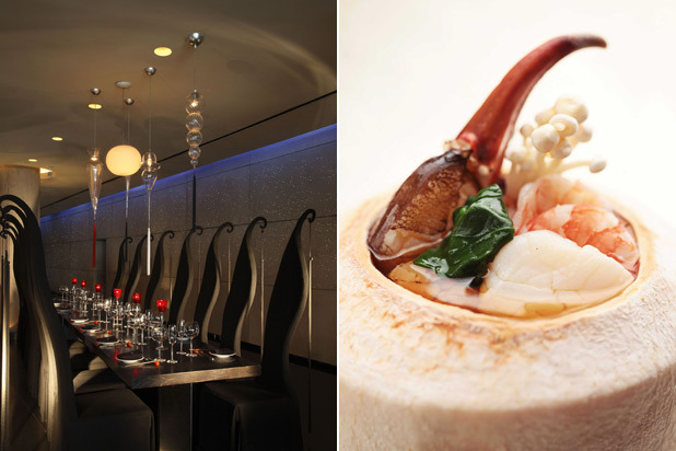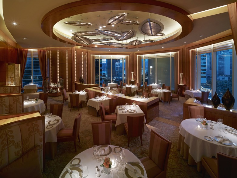 The first Chinese restaurant anywhere to be awarded three Michelin stars (and a featured establishment in The Daily Meal's inaugural 101 Best Hotel Restaurants Around the World), this opulent Cantonese restaurant is perched on the fourth floor of the Four Seasons Hotel, overlooking Victoria Harbor (the name means "view of the dragon"). In the 128-seat dining room, furnished with Chinese antiques and a hand-embroidered 7-foot-high silk and glass screen, executive chef Chan Yan Tak offers a tasting menu that includes crispy suckling pig, barbecued pork with honey, roast goose with plum sauce, wok-fried Australian Wagyu beef cubes with pepper, glutinous rice dumplings with cherry blossoms and red bean paste, and a baked almond puff with lotus seed paste. Dim sum and seafood are also specialties.