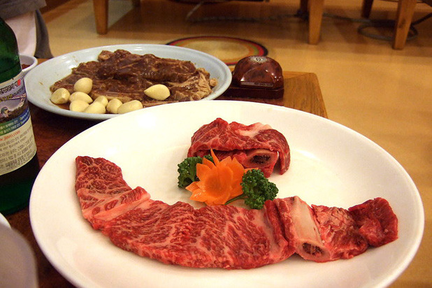 Like most of the best restaurants in Seoul, Byeokje Galbi specializes in one dish: beef ribs, served with a collection of side dishes including cabbage salad, roasted garlic, cold glazed sweet potatoes, kimchi, rice, green beans, pickled cabbage, onion with chiles, and soup. The tender beef is grilled over coals and melts in the mouth, much like Japanese Kobe beef — though the beef in fact comes from cows raised on a Pocheon farm under the direct management of the restaurant. Another dish, bulgogi (marinated beef), cooked at the table on a domed copper grill and served with green onions, enoki mushrooms, cold glazed sweet potatoes, kimchi, and pickled cabbage, is also worth a try.