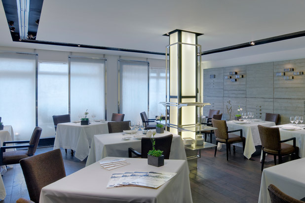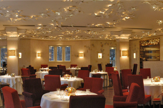 Alain Ducasse took over the dining room here not long ago from Yannick Alléno, and has reopened the place with a new menu and a "down-played" concept created in collaboration with his new executive chef Christophe Saintagne. The focus is now more on pure, simple ingredients rather than over-decorating or transforming dishes, and vegetables are moving into a starring role. Menu descriptions are brief: Vegetables and Fruits; turbot with olives; spicy lamb with artichokes; lobster. This simplicity doesn't come cheap. A seasonal collection menu features three dishes as well as dessert and cheese for about $520 per person, and even an appetizer of warm partridge pâté with cabbage runs $165. Refurbished by acclaimed designer Philippe Starck to reflect a 17th-century "grand siècle" décor, the restaurant's interior also draws inspiration from the Salon de la Paix at Versailles and showers diners in opulence. Think chandeliers, gilded glass doors, stunning views of the Tuileries Gardens, ornamented mirrors, and of course, Sunday-best attire. Le Maurice also ranked on number 22 in our 101 Best Hotel Restaurants list earlier this year.