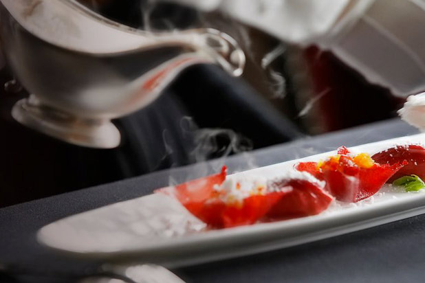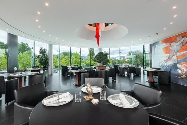 The team at Ikarus plays by its own rules, down to the kitchen crew donning black outfits instead of chef's whites, and checkered pants and black baseball caps emblazoned with Hangar-7 instead of toques. Hangar-7 is a building at Salzburg Airport owned by Dietrich Mateschitz, the founder of energy drink company Red Bull, which includes an airplane collection, art exhibits, and Ikarus. Chef Roland Trettl has been with the restaurant since it opened in 2003, but Ikarus has implemented a guest chef program, bringing in culinary stars from around the world to cook here for a month at a time. Jean-Georges Vongerichten, Spanish chef Xavier Pellicer (who took over the stoves at the Catalonian three-star El Racó de Can Fabes following the death of its founder last year), and German chef Rainer Becker have cooked here. Spanish chef Ramón Freixa helms the kitchen in December.