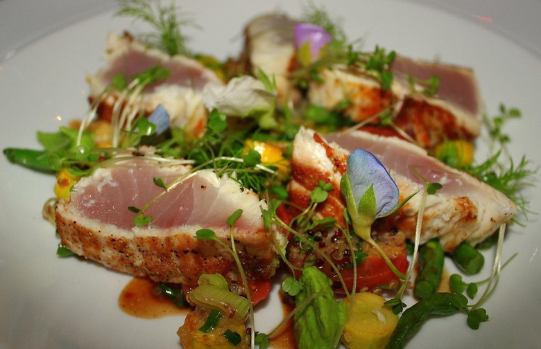 With direction from consulting chef Allen Susser, executive chef Jonathan Dearden serves a contemporary menu that marries the flavors of the Caribbean, Mediterranean, Pacific Rim, and Latin America. Dearden and his team source ingredients like cocoa, turmeric, cashews, almonds, and avocados from Jade Mountain's own tropical plantation, Anse Mamin, and lettuce, tropical vegetables, herbs, vanilla beans, bay leaf, nutmeg, cinnamon, mangos, sour oranges, limes, and plantains from Emerald Estate, a rain forest farm on the island. These ingredients are combined with local seafood, such as yellowtail snapper, grouper, cobia, wahoo, stone crab, conch, shrimp, and lobster to create a diverse menu. Past non-local dishes include a "caviar kiss" of smoked salmon cream and farm-raised caviar; dry-aged filet mignon with purple potato cake and grilled pumpkin; and "Chocolate vs. Vanilla," a dessert of flourless chocolate cake, vanilla custard cake, and white chocolate cashew ice cream.