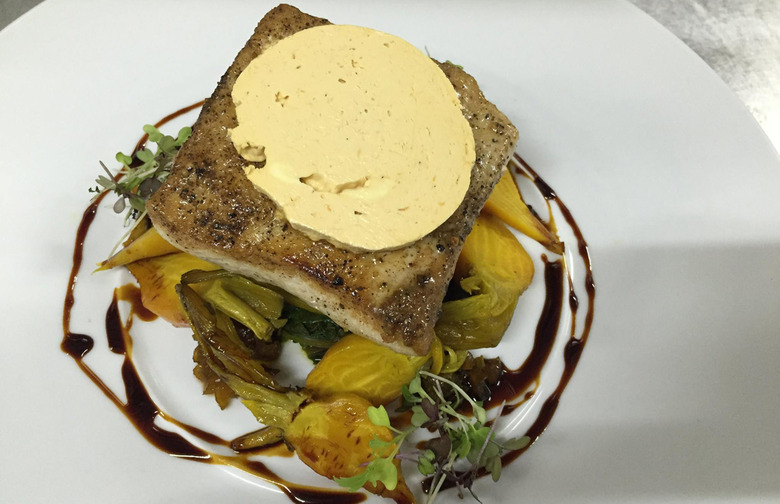 With direction from consulting chef Allen Susser, executive chef Jonathan Dearden serves a contemporary menu that marries the flavors of the Caribbean, Mediterranean, Pacific Rim, and Latin America. Dearden and his team source ingredients like cocoa, turmeric, cashews, almonds, and avocados from Jade Mountain's own tropical plantation, Anse Mamin, and lettuce, tropical vegetables, herbs, vanilla beans, bay leaf, nutmeg, cinnamon, mangos, sour oranges, limes, and plantains from Emerald Estate, a rain forest farm on the island. These ingredients are combined with local seafood, such as yellowtail snapper, grouper, cobia, wahoo, stone crab, conch, shrimp, and lobster to create a diverse menu. Past non-local dishes include a "caviar kiss" of smoked salmon cream and farm-raised caviar; dry-aged filet mignon with purple potato cake and grilled pumpkin; and "Chocolate vs. Vanilla," a dessert of flourless chocolate cake, vanilla custard cake, and white chocolate cashew ice cream.