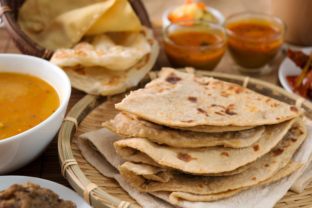 It may look similar to the hardworking tortilla, but this unleavened bread from India is typically made on a traditional griddle called a tava, and baked until it's very thin. Where poufy, doughy naan is rarely eaten on a daily basis in India, the slimmer roti is a daily staple and works at every meal, served with yogurt, honey, cooked vegetables or curries (or really, whatever you've got to eat with it).