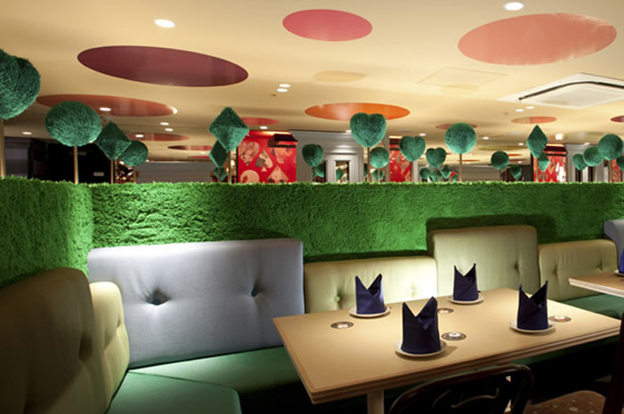 "Eat me" and "drink me" are requisites for all the menu options at this Alice in Wonderland-themed restaurant in Tokyo, since most choices stick with the theme — there's pizza modeled after the Cheshire Cat's tail and pasta arranged into the shape of a cat's face. But it's not just the food that's a draw: this unique eatery has a chandelier made of hearts, mammoth books making up a hostess stand, and even its own Queen of Hearts-inspired "forest maze" inside the restaurant. We wouldn't be surprised if you ran into the Mad Hatter.