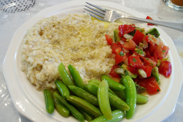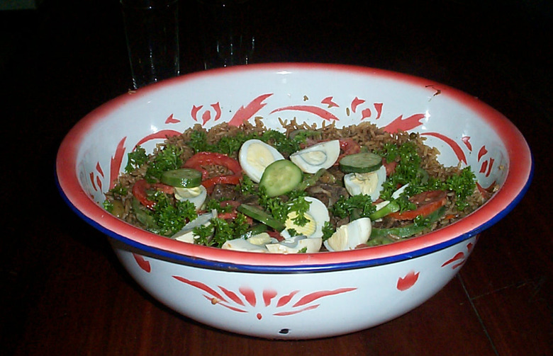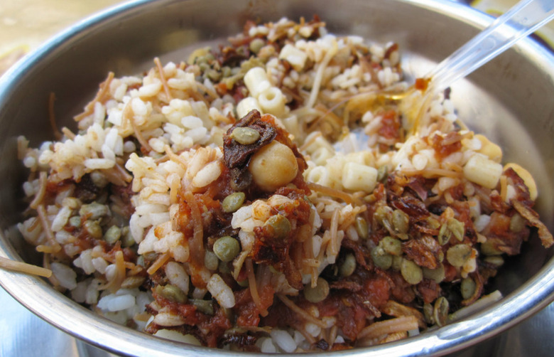 Koshary, a vegetarian dish comprised of rice with lentils, chickpeas, and macaroni, is often topped with any number of various additions, from tomatoes to fried onions. One of the best can be found at Abou Tarek Koshary in Cairo.