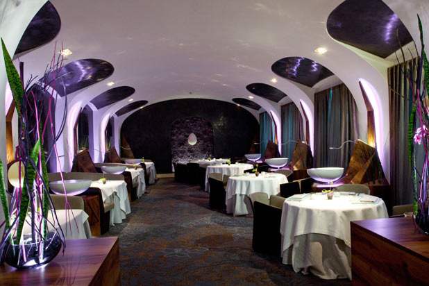 The team at Ikarus plays by its own rules, down to the kitchen crew donning black outfits instead of chef's whites, and checkered pants and black baseball caps emblazoned with Hangar-7 instead of toques. Hangar-7 is a building at Salzburg Airport owned by Dietrich Mateschitz, the founder of energy drink company Red Bull, which includes an airplane collection, art exhibits, and Ikarus. Chef Roland Trettl has been with the restaurant since it opened in 2003, but Ikarus has implemented a guest chef program, bringing in culinary stars from around the world to cook here for a month at a time. Jean-Georges Vongerichten, Spanish chef Xavier Pellicer (who took over the stoves at the Catalonian three-star El Racó de Can Fabes following the death of its founder last year), and German chef Rainer Becker have cooked here. Dutch chef Jacob Jan Boerma is helming the kitchen this month and Spanish chef Ramón Freixa takes over in December. Boerma's menu features Gillardeau oysters with herbs and hollandaise; Jerusalem artichokes with ras al hanout vinaigrette and radishes and mackerel sashimi with Japanese persimmon, radish, and cucumber tapioca.