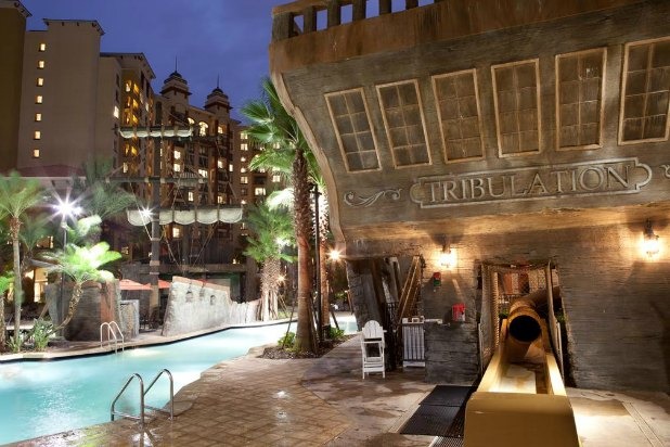 The hotel features a pirate ship slide and its seafood restaurant, deep blu seafood grille is offering a $40 three-course tasting menu in August. deep blu seafood grille specializes in sustainably caught seafood that is cooked within 36 hours of being caught.