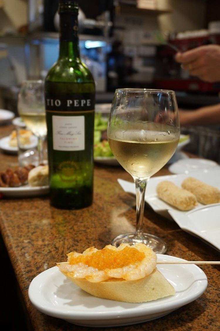 To drink: Tío Pepe Dry Sherry. Sherry is underrated. This one has some notes of citrus and is creamy, making it food-friendly – especially with the salty, juicy, spicy flavors in the pintxos mentioned here.