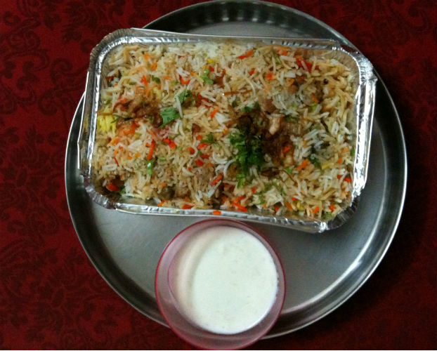 Head to Paradise Food Court in Hyderabad to pick up biryani, a classic Indian dish with marinated meat, vegetables, rice, and spices.