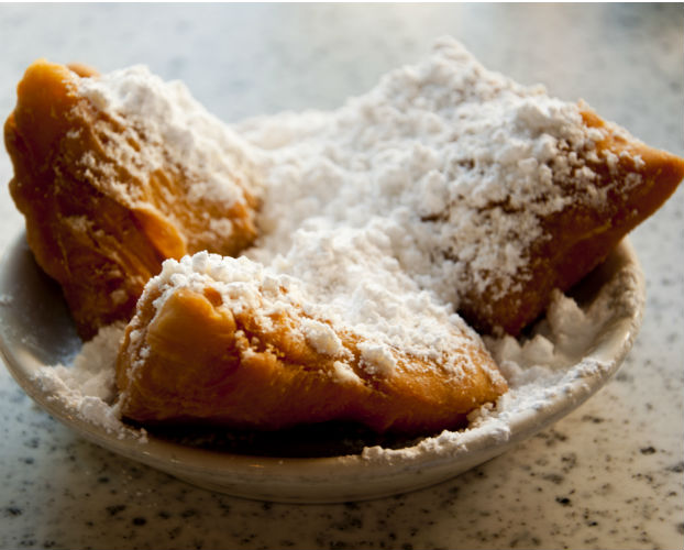 At Café du Monde in New Orleans, delicious beignets are the star of the menu. They're topped with powdered sugar.