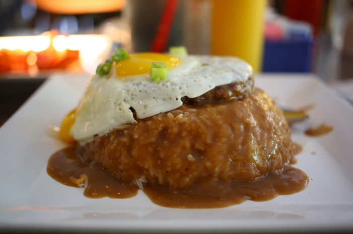 Loco moco is Hawaiian comfort food consisting of white rice topped with a hamburger patty and an egg fried sunny side up, with all of it smothered in gravy. It was reportedly invented for a group of teenagers around 1949 in Hilo.