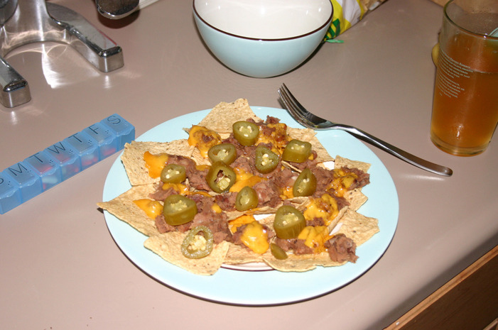 Texas nachos are fried tortillas traditionally topped with Longhorn cheese, pickled jalapeños, and salt to taste. Some add refried beans and sour cream to give the dish extra flair.