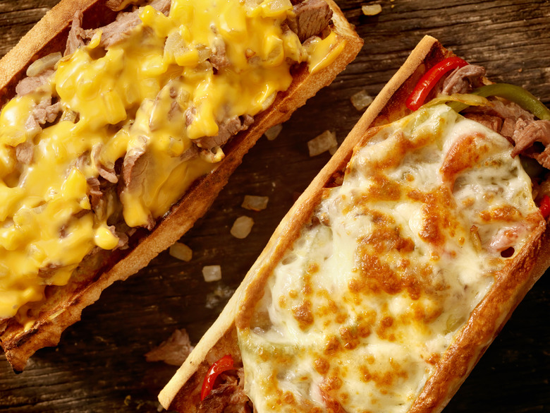 This famous Philadelphia sandwich consists of thin slices of "frizzled" steak and melted American cheese (or even Cheez Whiz) contained in a hoagie roll. Sautéed onions and bell peppers are also often included.