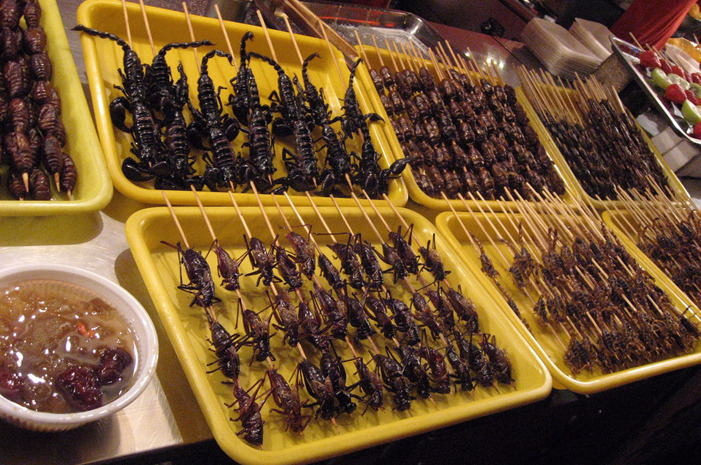 Bugs appear on the menus of different restaurants across China. In a Beijing market, you can order silkworm chrysalises, black spiders, or scorpions, and they're often served on a stick. Some northern Chinese restaurants also offer scorpions and silkworm chrysalises, as well as cicada larva and locusts.