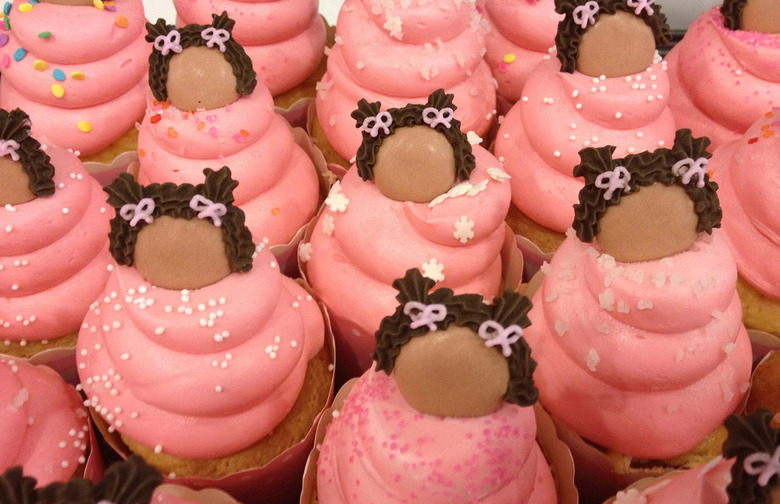 Pink Cake Box's cupcake designs include tiny roses, round baby faces with hats and pacifiers, and colored flower petals with chocolate centers. The bakery also creates specialty and wedding cakes.