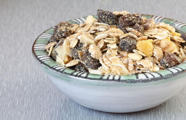 Muesli consists of dry rolled oats mixed with fresh or dried fruits, seeds, and nuts, moistened with a wet component (like milk, yogurt, or fruit juice). Store-bought muesli can contain high amounts of sugar that will make you crash not long after your boost, but if you make homemade muesli, you can control the ingredients and make the most of the high amounts of fiber, antioxidants, and protein present in the cereal, fresh fruit, and nuts.