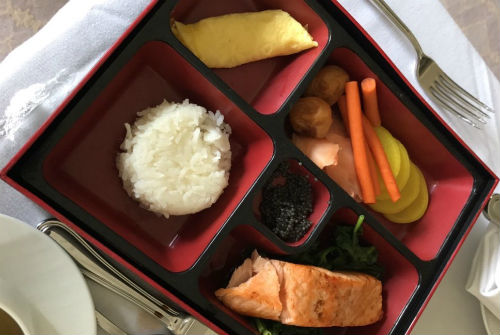 A definite must-try for the luxe staycationer is the Ritz's in-room Japanese breakfast. Served in a bento box, this breakfast includes miso soup, seared salmon and caviar, steamed rice and pickled vegetables, a Japanese omelet, and green tea.