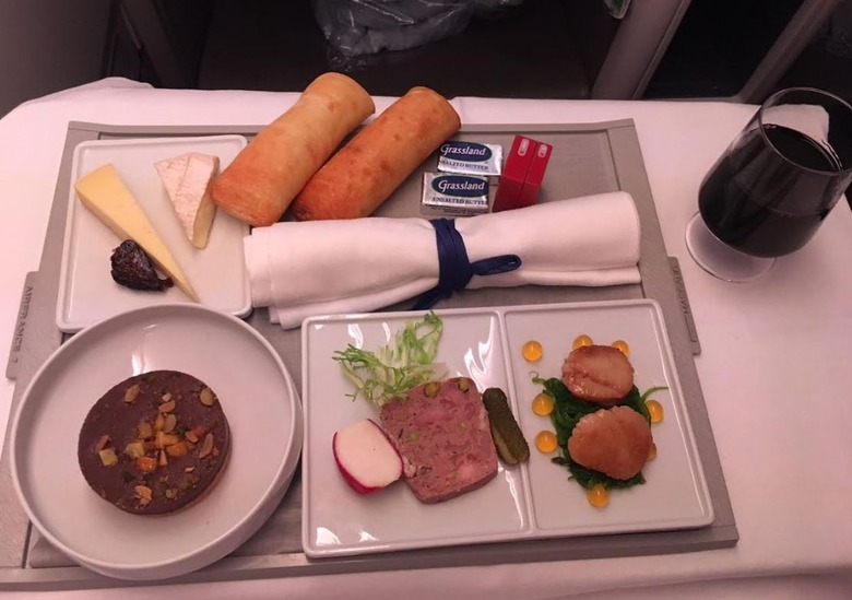 Before dinner service, you can choose from a nicely curated selection of Champagne and wine: Laurent-Perrier Champagne, 2015 Chateau l'Hospitalet Coteaux du Languedoc Blanc, 2014 Dauvergne et Ranvier Vallee du Rhone Rouge, and 2010 Chateau La Cardonne Bordeaux Rouge. Dinner service began not too long after takeoff with an appetizer of pheasant terrine with figs as well as scallops with mango pearls and seaweed salad. The terrine was stellar and the scallops, served cold, were nicely cooked and creatively complemented by the seaweed salad and sweet pops of mango.