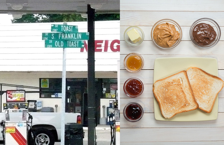 Residents of Toast, North Carolina, insist their unusual town name actually has nothing to do with food. When trying to come up with a name for their rising town in the 1920s, local residents were plagued with difficulty. They weren't allowed their first choice, Franklin, because it was already taken by another town. No one could come up with a good second or third choice, and residents began squabbling. An impromptu decision was made when one gentleman spotted an old shoebox. The color of the shoes inside was labeled "Toast," and according to local legend, the man said, "What the hell, let's just call it Toast!" and so they did.