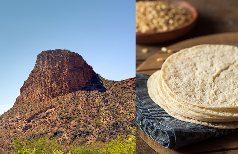 With a population of 6, Tortilla Flat — "the town too tough to die" — is the last remaining authentic stagecoach stop on the Apache Trail. A letter dated from 1939 says the area was christened "Tortilla Flat" after Tonto Basin pioneer John Cline and a few friends were stranded in the flat by a flash flood, and when they ran out of food, used their remaining flour to make tortillas and survive. Other stories say it was named for a nearby tortilla-shaped butte. Speaking of tortillas, we recently found the spiciest tortilla chip on the market, and it's really hot.