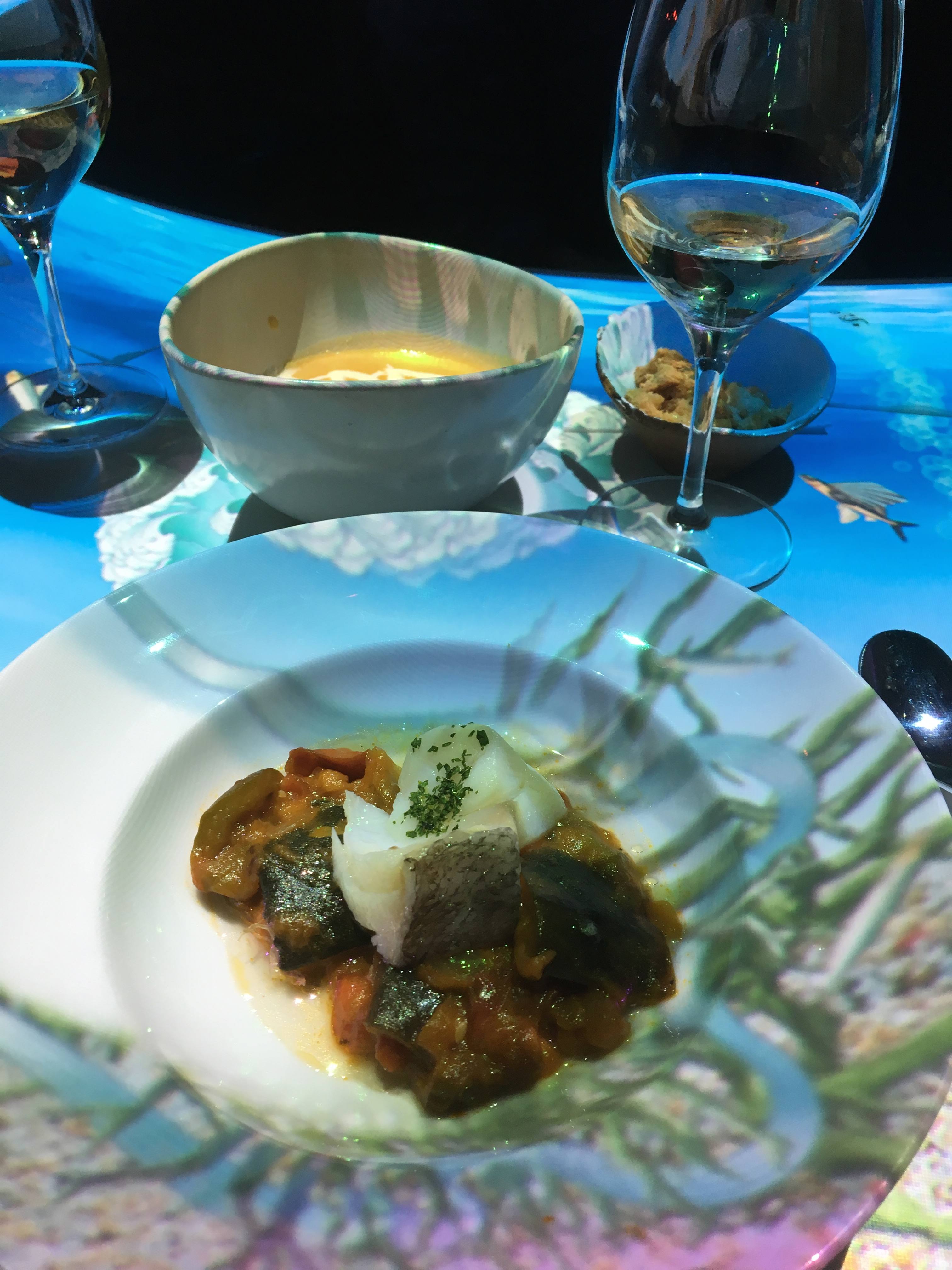The "Barra Solidaria" features tapas created by a series of alternating local chefs such as Nandu Jubany, Albert Adrià, Carles Abellán, Quim Marqués and Christian Escribà with proceeds donated to a local orphanage, while the "Diva" section serves seasonally changing tasting menus with wine pairings on circular tables for eight with a server-croupier in the center narrating the dishes and products. Cod in samfaina is the signature dish, while the shepherd's pie of calf cheek and tail is the closer. Overhead projectors illuminate each offering with colorful themes of fish, vegetables, landscapes, and livestock.