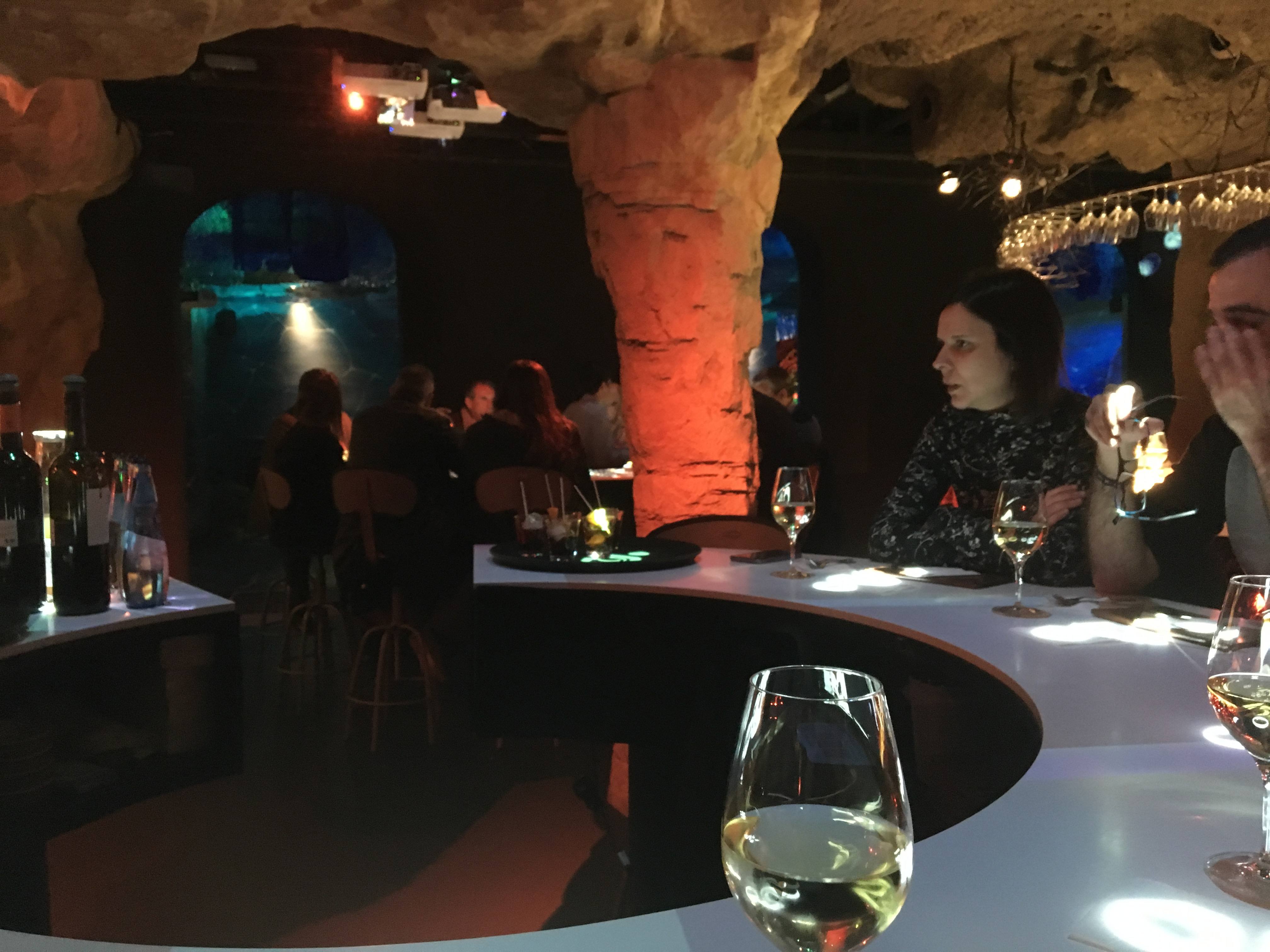 Annette Abstoss, a founding partner in the project and longtime Barcelona food and culinary expert (her 2005 CUINASIA symposium brought together Asian chefs from around the world) showed us through the various elements of this underground gastronomical wonderland. After the upstairs "Vermuteria", the vermouth bar specializing in the classical Catalan aperitif, we took the stairs down past a series of animated dioramas that chronicle the history of Catalunya. At the bottom of the stairs is the "Odissea" room containing a circular sixteen-seat table where a short animated film explains Catalunya and its most traditional food products — olives, grapes, cheeses, sausages, and seafood — along with a tasting.