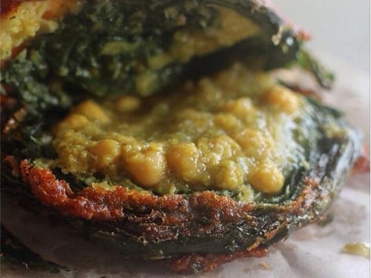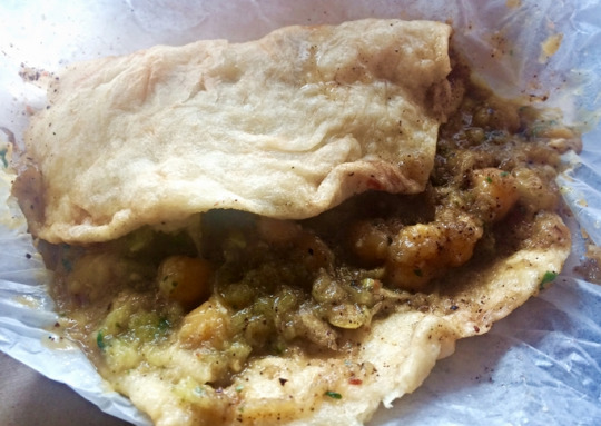 What it is: Though it's not as common as other street foods, saheena is just as delicious. It might be the only opportunity to eat some greens when it comes to street food, albeit those greens are fried. Saheena is typically made with dasheen (taro) leaves, flour, split pea powder, and other seasonings — and it's either fried in balls or wheels like the image below. The saheena I ate was topped with channa, but many usually eat saheena with mango chutney or tamarind sauce.