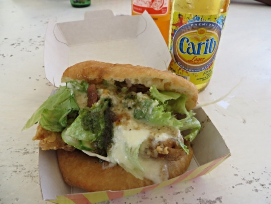 What it is: Bake and shark is another very popular street food in Trinidad, and rightly so. This sandwich consists of fried dough — the "bake" — filled with fried shark meat, hence the term "bake and shark." Similar to a burger or chicken sandwich, you can add all sorts of toppings to this street food, like tomato, lettuce, ketchup, mustard, garlic sauce, and a highly addictive cilantro sauce that I cannot recommend enough.