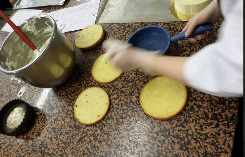 When cut, the cake layers are soaked with a mix of sugar and water. Proper soaking is important to get a deliciously moist cake.