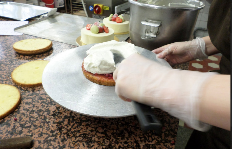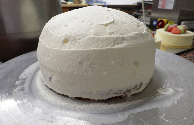 After the jam, whipped cream is spread evenly on each layer. To make it easier, the cake is put up on a rotating cake tray.