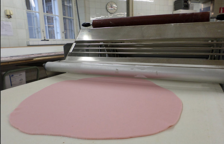 The pink marzipan is prepared by flattening it out with a massive electric rolling pin.
