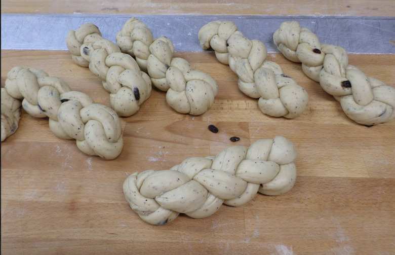 The beginning stages of a braided bun. The classic dough is studded with raisins — and cardamom, of course.