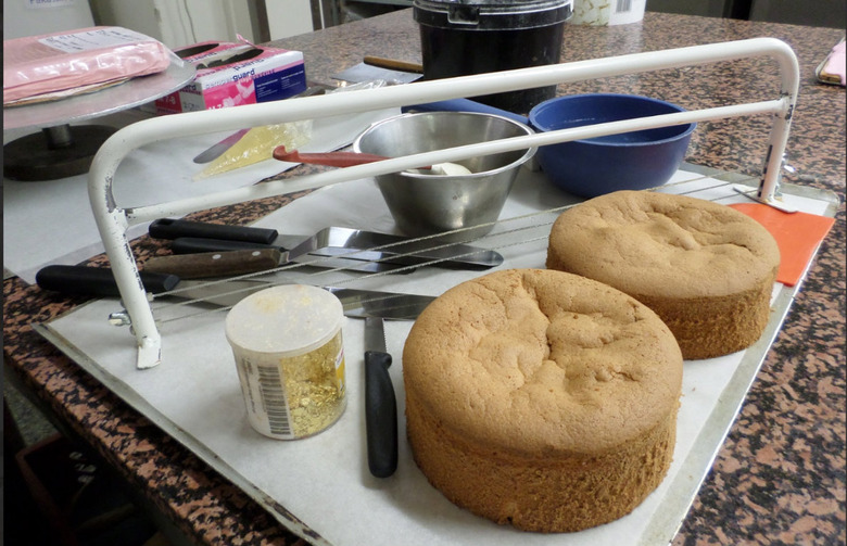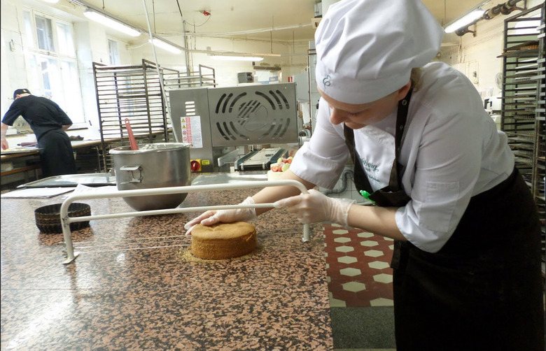 Head pastry chef Susanna Suhonen had prepared the cake base, and I was put in charge of the building. Here she is showing how they cut the cake with a "cake saw" to get even layers.