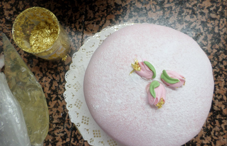 When the cover was successfully draped over and trimmed around the edges, it was time for a final touch with nothing less than sugar roses and edible golden leaves. To the left is pastry chef Suhonen's perfect cake — ready for the bakery — and to the right my extra-tall version. Since there was an extra layer of cake after the initial cutting, I thought I'd improvise and incorporate it in the cake.