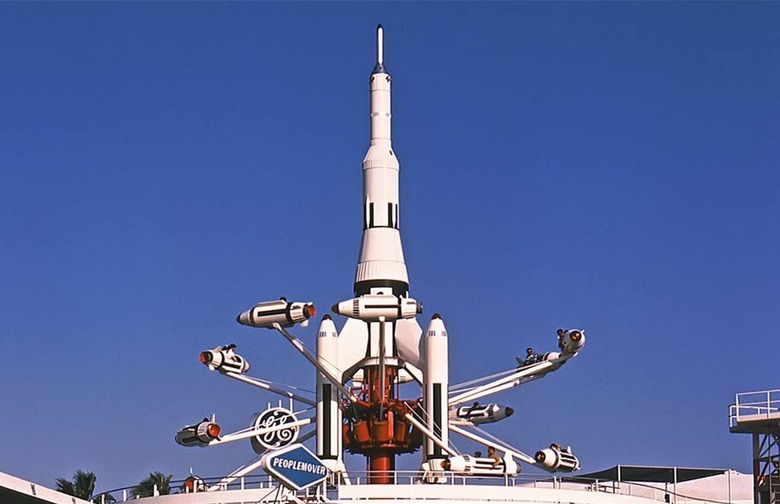 Located above the People Mover station, Rocket Jets offered riders a quick spin in rockets with a bird's eye view of Tomorrowland. The ride actually replaced a similar attraction called Astro-Jets, which was less popular. Closed in 1997 for the New Tomorrowland renovations, the structure remained as a spinning sculpture called the Observatron.