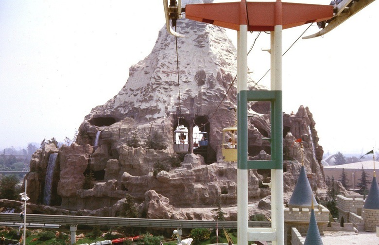 This lift took visitors from Tomorrowland to Fantasyland within Disneyland until it closed in 1994. It was incorporated into the Matterhorn Bobsleds roller coasters — the story is that the Abominable Snowman left the skyway buckets torn on the hill.