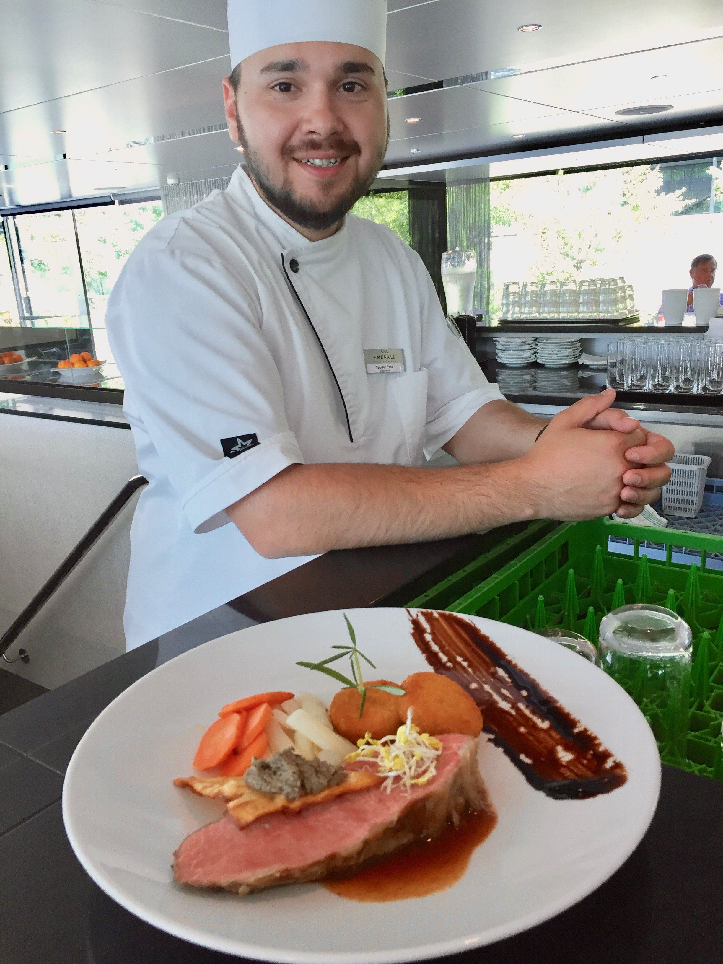 Complimentary beer and wines served at lunch and dinner reflect this voyage's route. From Châteauneuf-du-Pape to Beaujolais to Provençal rosé, the ship's cellar consistently provided excellent vintages at every meal. And to go along with these wines, Emerald launched a relationship that is truly unique in Rhône River cruising: They invited Fabien Morreale, fourth runner up on France's version of the television show Top Chef, to prepare a meal expressly for passengers.