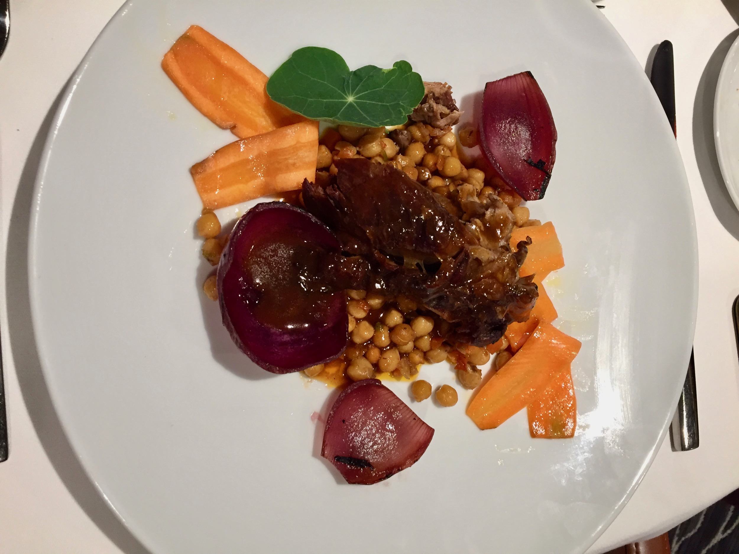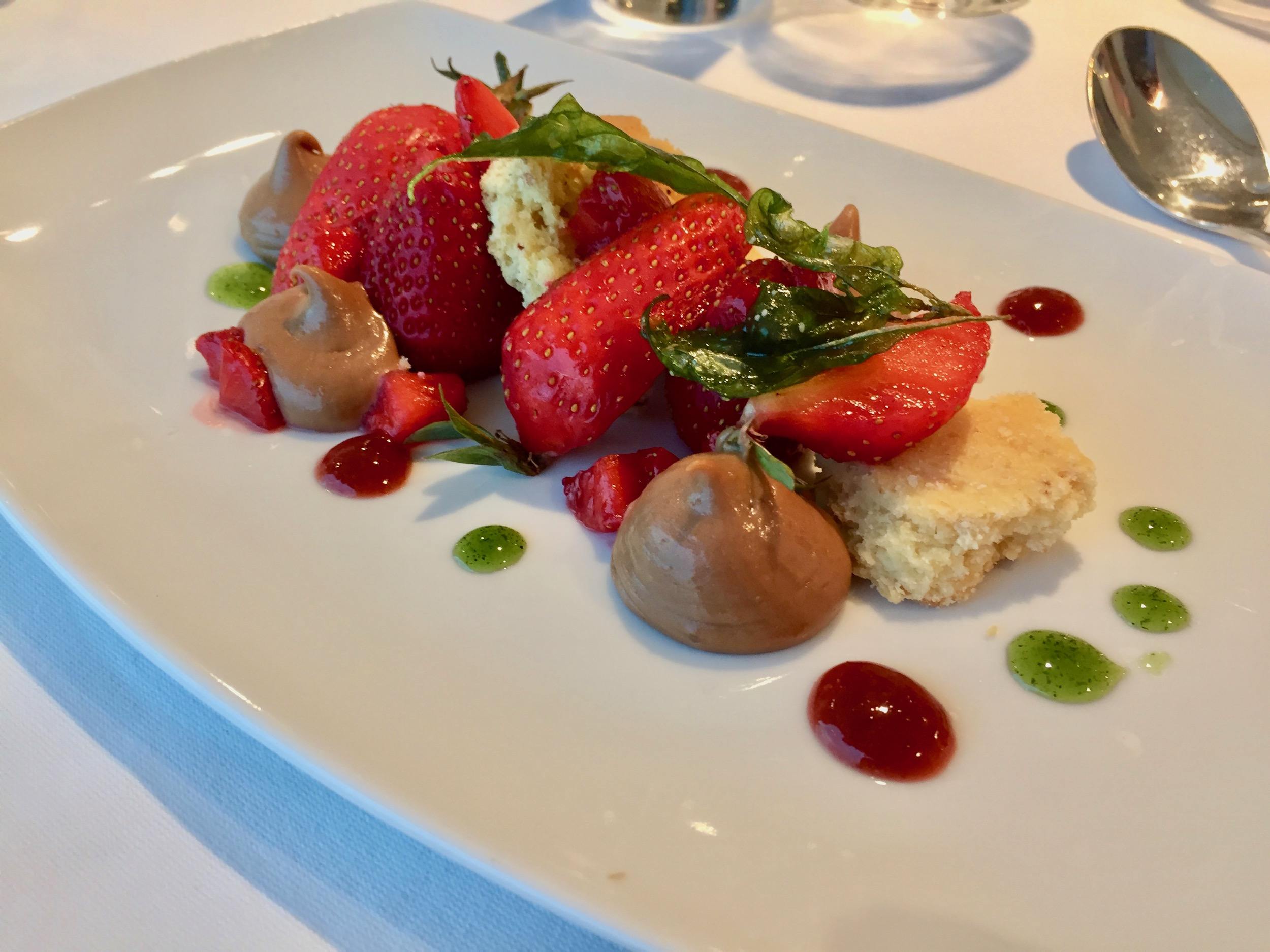 For his dinner aboard Emerald Liberté, Morreale's menu consisted of three completely Provençal dishes. His appetizer course of crunchy local green vegetables, goat cheese, and locally produced olive oil with house crackers was not only sublimely beautiful to look at, its fresh flavors leapt off the plate. This was followed by a main course consisting of Sisteron lamb and served with chickpeas and candied vegetables. The lamb was prepared using a traditional Provençal recipe that takes eight hours of cooking. It was tender enough to eat with a spoon. Finally, Morreale's sister, a former pharmacist and now his pastry chef, may have had a hand in the strawberry tart de Provence. This luscious dessert featuring the first spring strawberries was accompanied by a biscuit and artfully arranged hazelnut noisettes. The dinner was accompanied by two specially selected wines: Petit Bourgeois 2016, a medium-bodied dry white from the Loire Valley, was paired with the vegetable course. The red wine on offer with the lamb was more local: Fleurie 2015, a Beaujolais from Domaine des Fonds, an intense yet silky red.