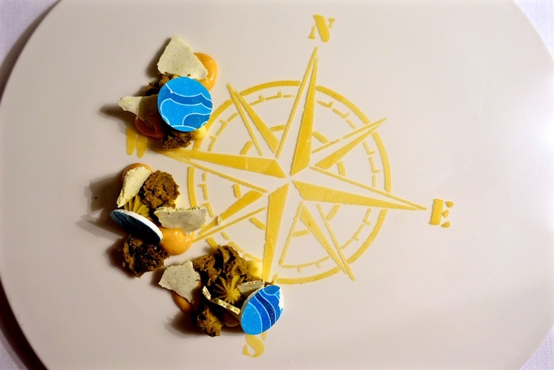 Dessert's attempt to follow the seafood concerto is a hit and miss affair, which pushes the boundaries of traditional Italian cuisine. Chef Palamaro's dessert sushi of seaweed, caramelized salmon, and sweet rice, is unfortunately, memorable for seriously lamentable reasons, as an overambitious chimera better suited to being photographed, rather than actually eaten. On the other end of the spectrum, the use of sea urchin in another dessert is much more prosperous. On top of a base of lemon curd, meringue, and pistachio sponge, sits a sea urchin mousse. "Because the theme is the 'sea', I wanted to depict aspects of the sea even in the desserts," explains the Michelin star chef. "The taste of the sea urchin is also, in a way, similar to egg yolk, which is often used in desserts." It brings a particular salty and sweet flavor to the plate, with a slight resemblance to a light butter. The composition itself makes reference to the striking shape of a sea urchin, with varying textures all unifying together in an arresting bite. The refreshing tartness from the lemon curd successfully prevails, cutting through any preconceived hesitations deriving from the seabed; it's a capable dish, that most guests will experience as a peculiar and memorable dining first.